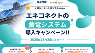 Q.ENESTホールディングス株式会社が、太陽光発電をお持ちの方向けに「エネコネクトの蓄電システム導入キャンペーン」をスタート!東京都では補助金を使って実質0円で蓄電池が手に入るかも。電気代をグッと抑えて、さらにキャッシュバックで年間最大約6,400円もお得になるチャンスだよ。