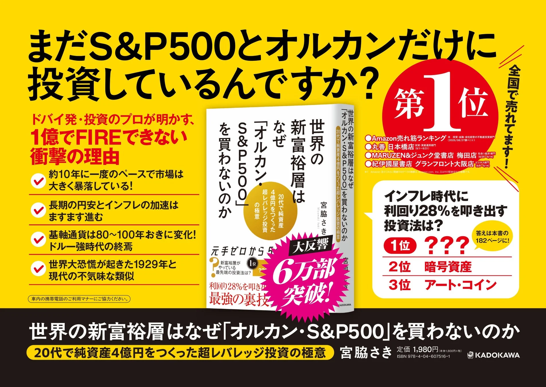 2025年8月26日の発売からわずか4ヶ月で6.5万部を突破した宮脇さき氏の著書『世界の新富裕層はなぜ「オルカン・S&P500」を買わないのか』(KADOKAWA)が、2026年1月5日(月)から1月11日(日)の期間、首都圏JR全線およびつくばエクスプレスにて電車内広告を掲出します。