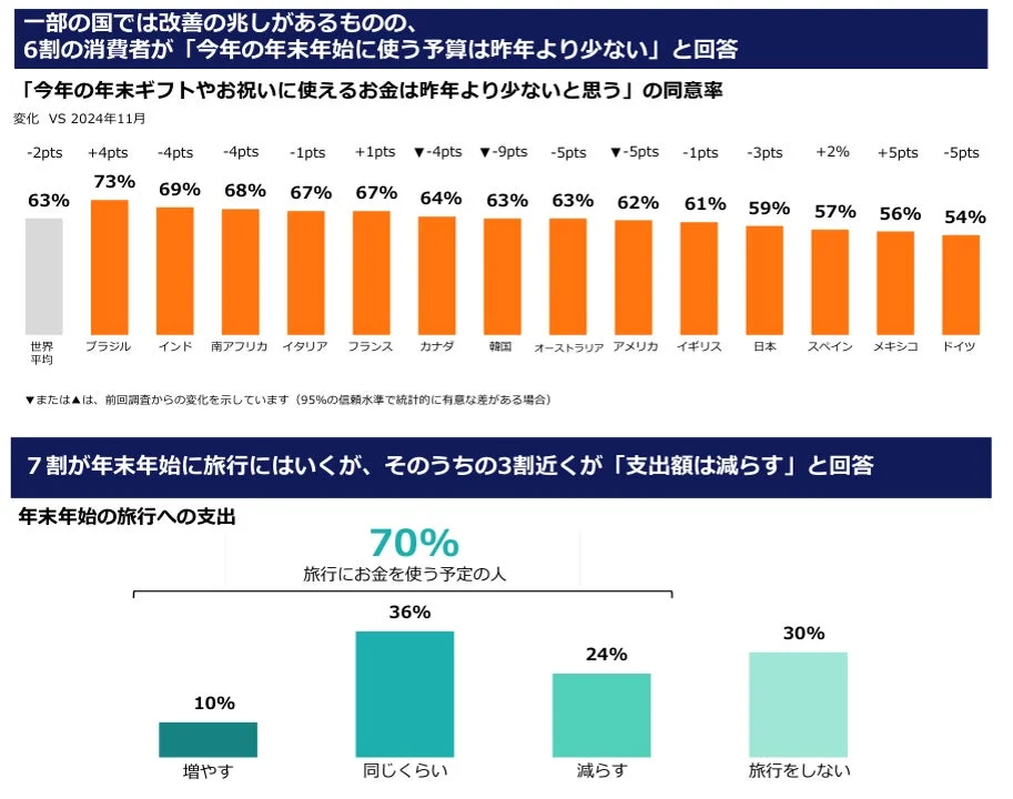 まず目を引くのは、多くの人が年末年始の予算を昨年より抑えようとしている点です。15カ国の平均では、なんと60%以上の生活者がギフトやお祝いに使える予算が減少すると回答しています。節約志向が世界的に広がっていることが伺えますね。