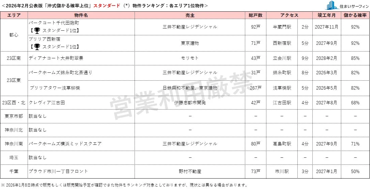今回公表された2026年2月版のランキングでは、首都圏の販売中および販売予定のマンションが対象です。物件は「スタンダード」(3LDKや4LDKの間取りが多い)と「家活」(1LDKや2LDKの間取りが多い)の2つのタイプに分けて発表されています。