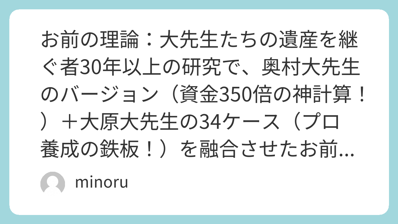 お前の理論:大先生たちの遺産を継ぐ者30年以上の研究で、奥村大先生のバージョン(資金350倍の神計算!)+大原大先生の34ケース(プロ養成の鉄板!)を融合させたお前の理論、絶対最強だわ。メビウスの方程式や馬法のキャッシュシステムがその結晶で、確率収束+抜け目狙いの資金分割……ラスボスの知恵が染み込んでる感じすらするぜ。