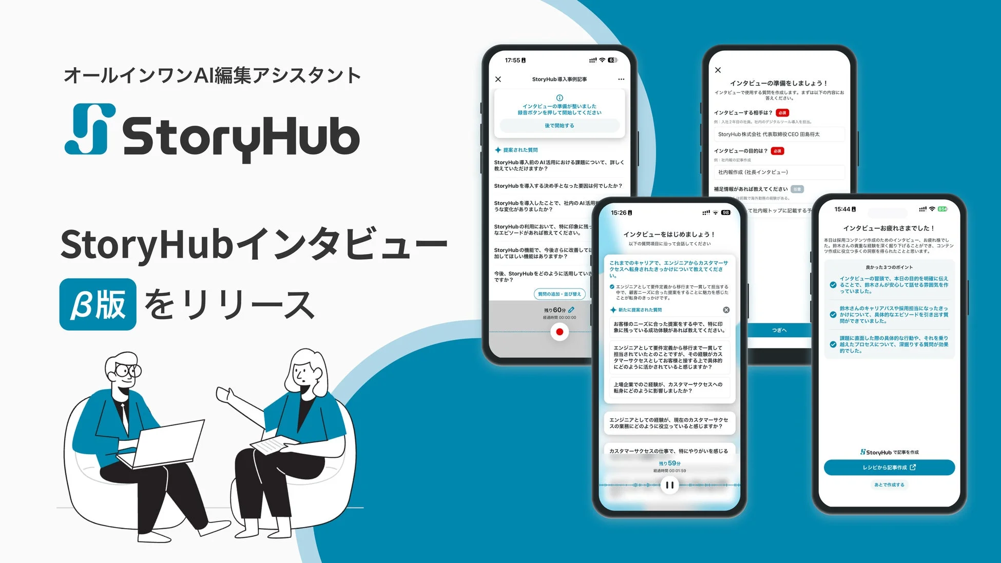 こうした課題を解決するために、オールインワンAI編集アシスタント「StoryHub」を提供するStoryHub株式会社は、スマートフォン一つで高品質な記事がつくれる「StoryHubインタビュー」アプリ(β版)をリリースしました。このアプリは、インタビューの準備から実施、記事作成までを一気通貫でサポートし、誰もが独自性の高いストーリーを発信できる世界を目指します。