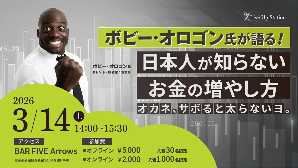 2026年3月14日(土)に、タレント、格闘家、そして実業家として知られるボビー・オロゴン氏が登壇する「日本人が知らないお金の増やし方」特別セミナーが開催されます。このセミナーは、新宿の「BAR FIVE Arrows」でのリアル開催と、ご自宅などから参加できるオンライン(ZOOM)でのハイブリッド形式で行われます。