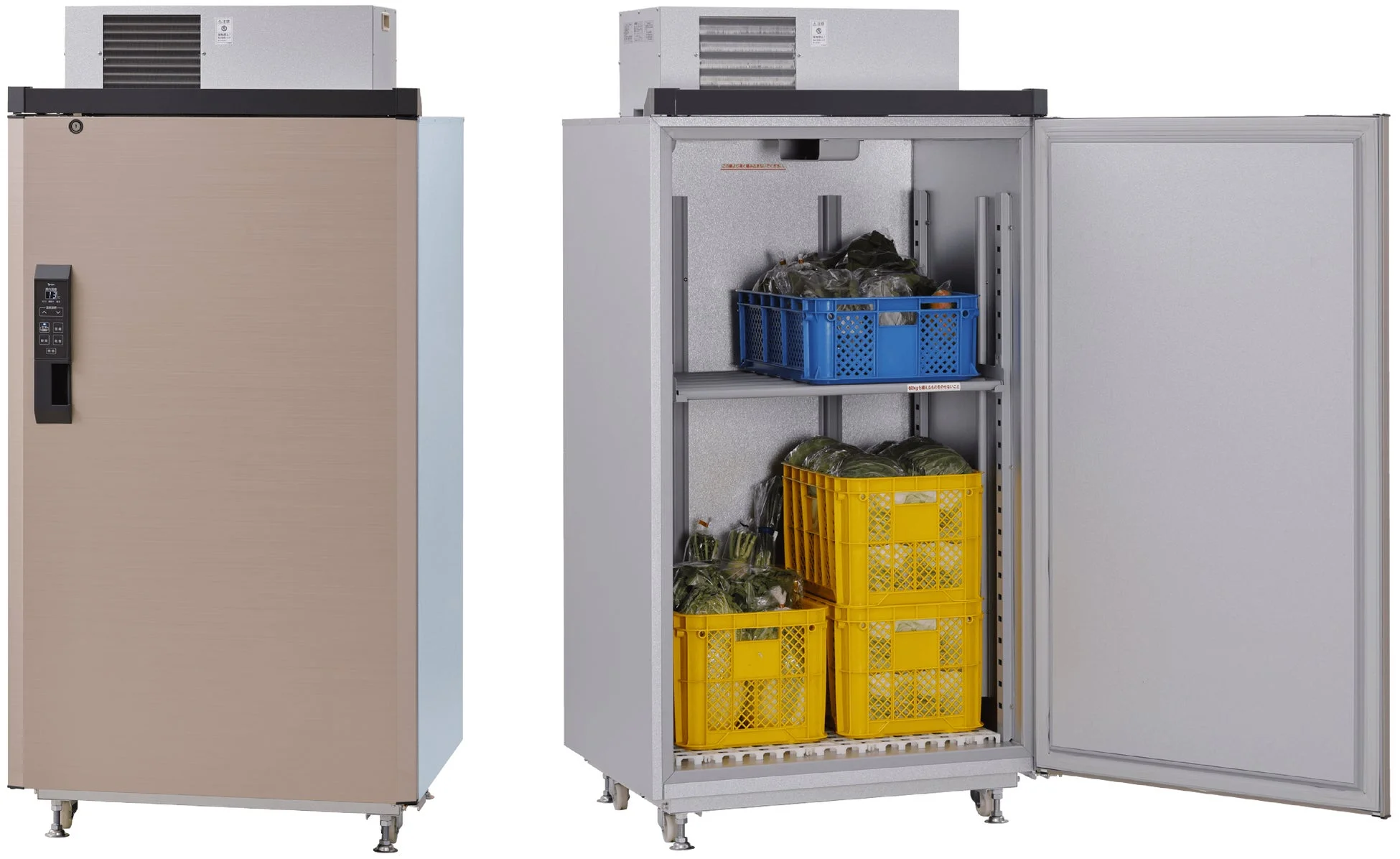 業務用冷蔵庫が2台並んでおり、右側の冷蔵庫は扉が開いており、内部には青と黄色のコンテナに入った野菜が収納されています。食材の保管に適した大型の冷却装置です。