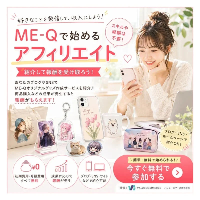 この機会に、あなたもME-Qアフィリエイトで、オリジナルグッズ市場という新しいジャンルでの収益化に挑戦してみませんか?自分の「好き」を発信することが、誰かの役に立ち、そしてあなたの収入につながるかもしれません。