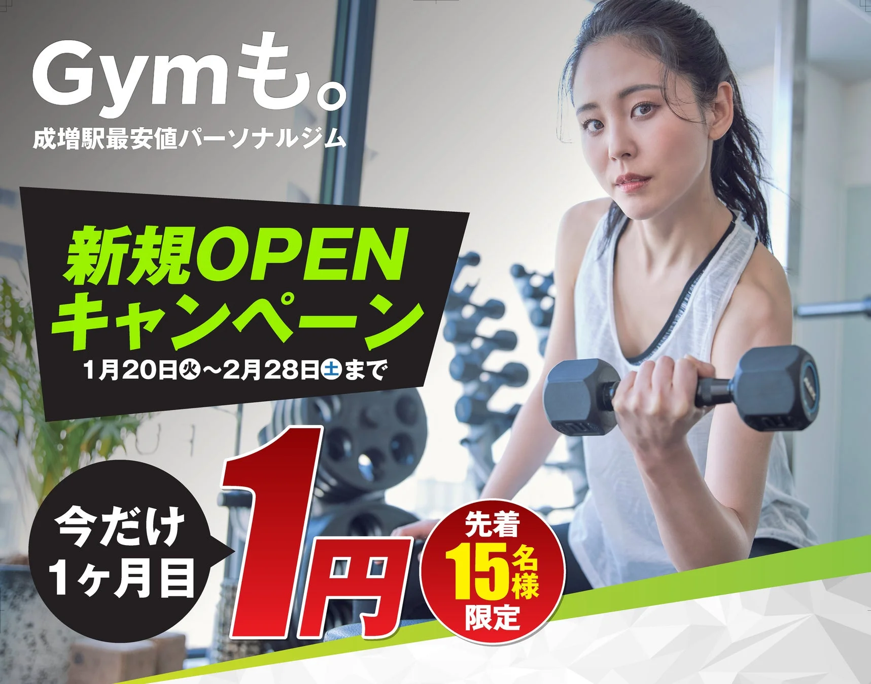成増駅最安値のパーソナルジム「Gymも。」の新規OPENキャンペーンを告知する画像です。女性がダンベルでトレーニングをしており、1ヶ月目が1円になる先着15名限定の特典が目を引きます。