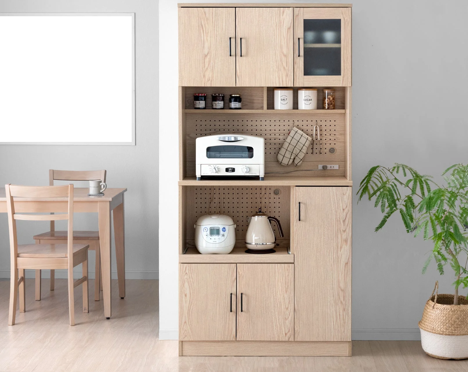 調理中によく使うアイテムを手の届く場所に配置することで、作業効率が格段にアップします。さらに、この有孔ボードは、炊飯器の蒸気や電子レンジ使用時の熱を効率よく逃がし、収納内部の劣化やカビの発生を抑える効果も期待できます。2口コンセントも備わっているため、家電を置いたままスムーズに使えるのも嬉しいポイントです。