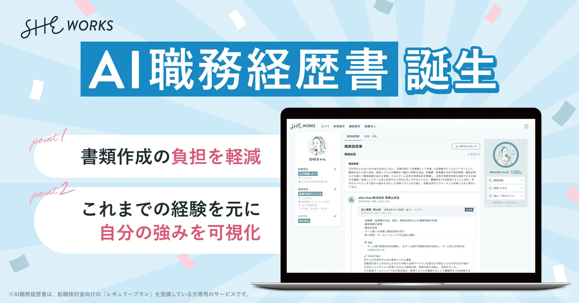 もしあなたが今、キャリアチェンジを考えているなら、SHElikesのAI職務経歴書が、きっとその一歩を力強く後押ししてくれるはずです。