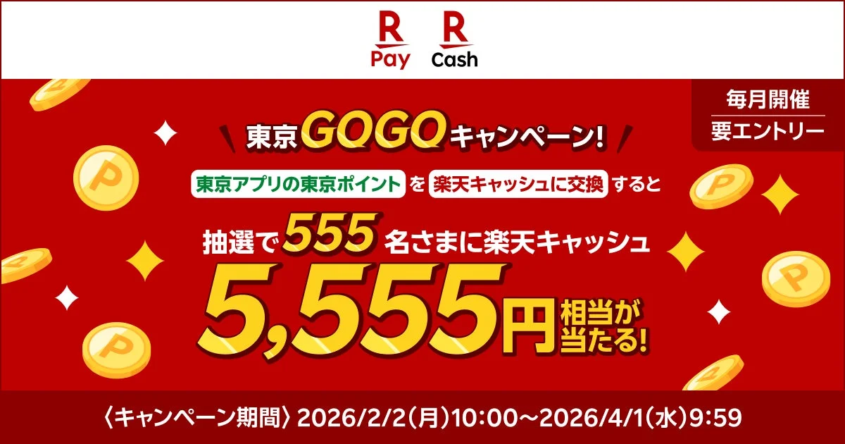 このキャンペーンは、2026年2月2日(月)から4月1日(水)までの期間中、エントリーのうえ、「東京都公式アプリ」で貯めた「東京ポイント」を1,000ポイント以上「楽天ペイ(楽天キャッシュ)」に交換すると、抽選で555名に5,555円相当の「楽天キャッシュ」が当たるというもの。日々の暮らしがお得になるチャンスをぜひ活用してみませんか?