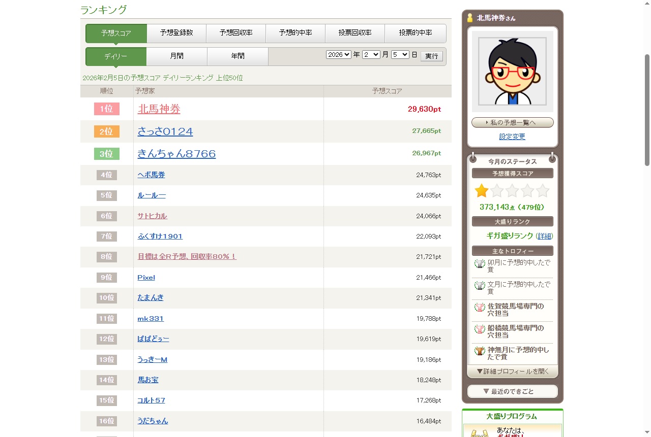 2026年2月5日、 楽天競馬「みんなの予想」にて公開されている 予想スコア デイリーランキングにおいて、 1位(29,630pt)を獲得しました。