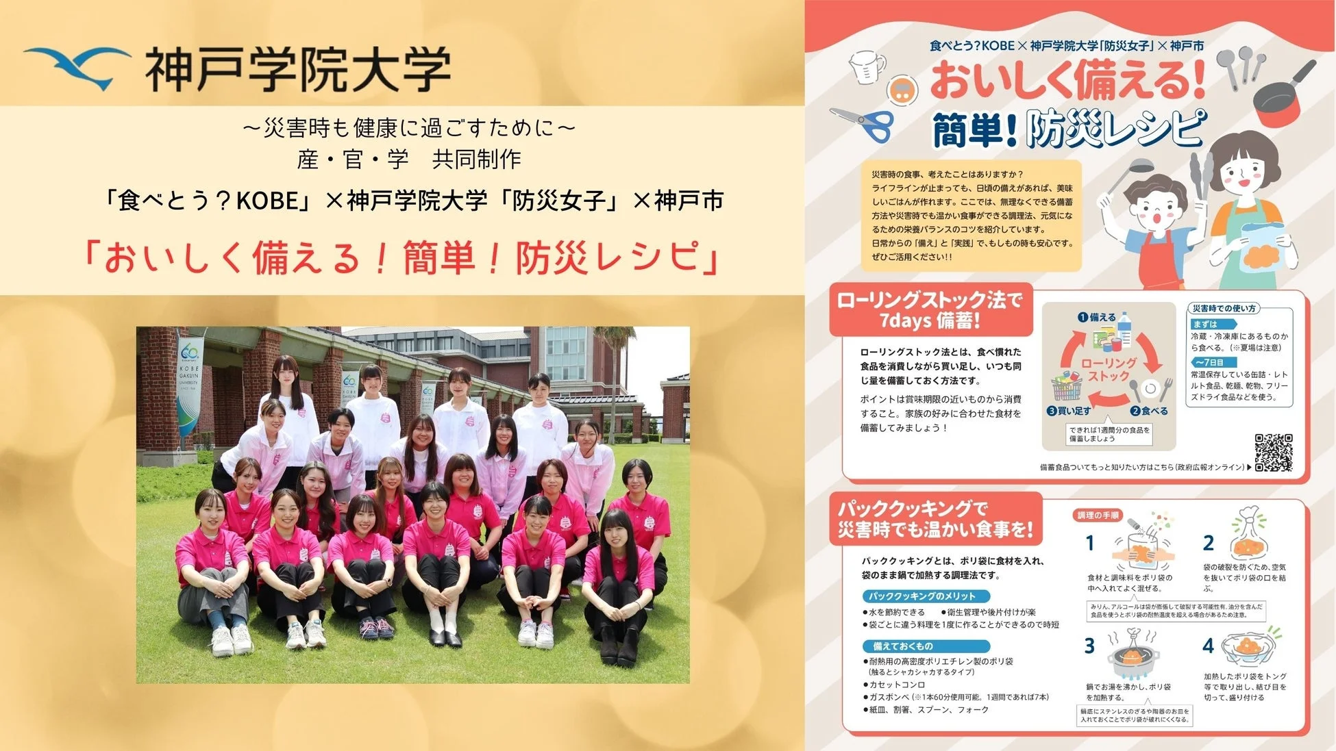 このレシピ集を制作した神戸学院大学の「防災女子」は、「災害時こそ女子力で乗り切っていこう!」をコンセプトに、女性目線での防災啓発に取り組む学生団体です。授業で培った専門知識を活かし、「やってみたくなる防災」を広める活動を行っています。