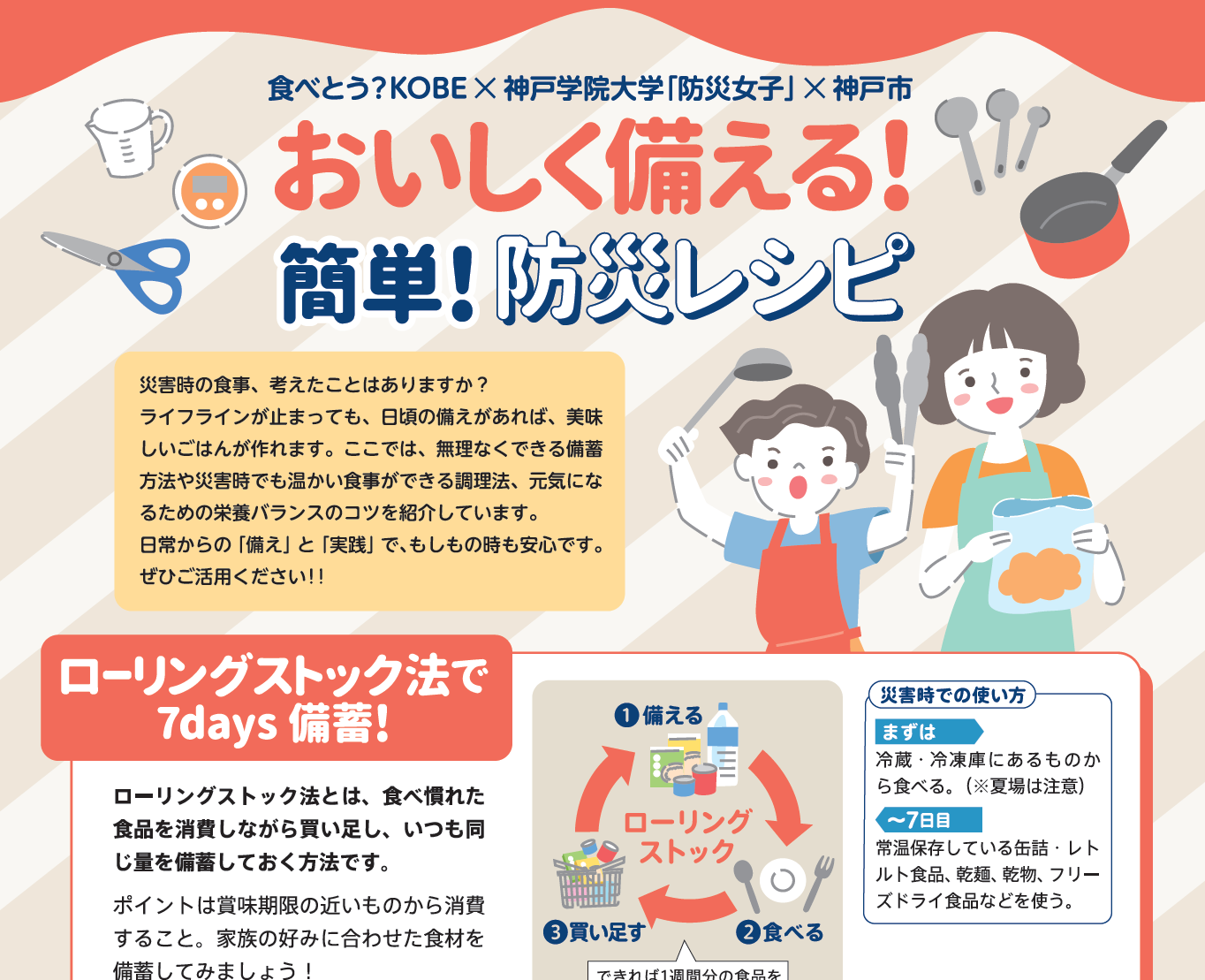 そんな「もしも」の時に役立つレシピ集が、神戸学院大学のサークル「防災女子」と「食べとう?KOBE」、そして神戸市の連携によって誕生しました。その名も「おいしく備える!簡単!防災レシピ」です。