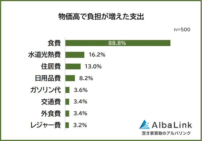 都市部に住む500人に「物価高で負担が増えた支出」を尋ねたところ、約9割が「食費(88.8%)」と回答しました。次いで「水道光熱費(16.2%)」、「住居費(13.0%)」、「日用品費(8.2%)」が続きます。