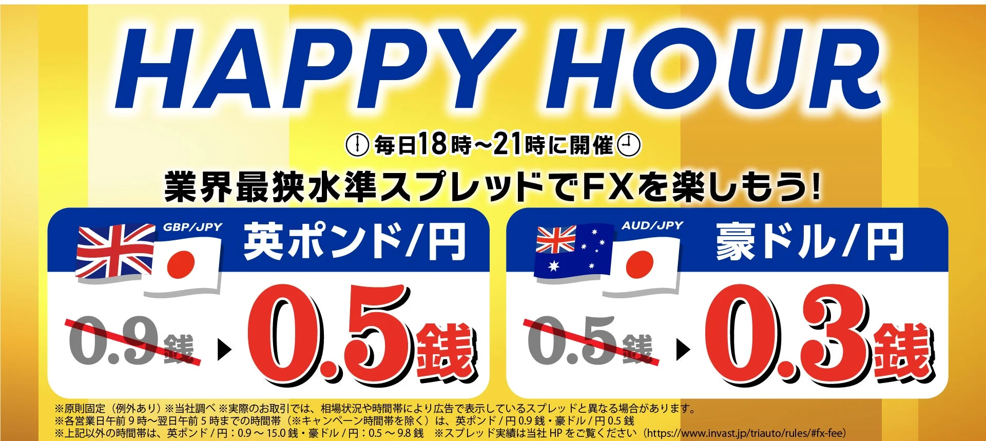 「FX取引に興味はあるけれど、コストが気になる…」そう感じている方も多いのではないでしょうか。そんなあなたに朗報です!インヴァスト証券が提供する外国為替取引サービス「トライオートFX」では、期間限定で特定の通貨ペアのスプレッドを大幅に縮小する「HAPPY HOURキャンペーン」が開催されます。