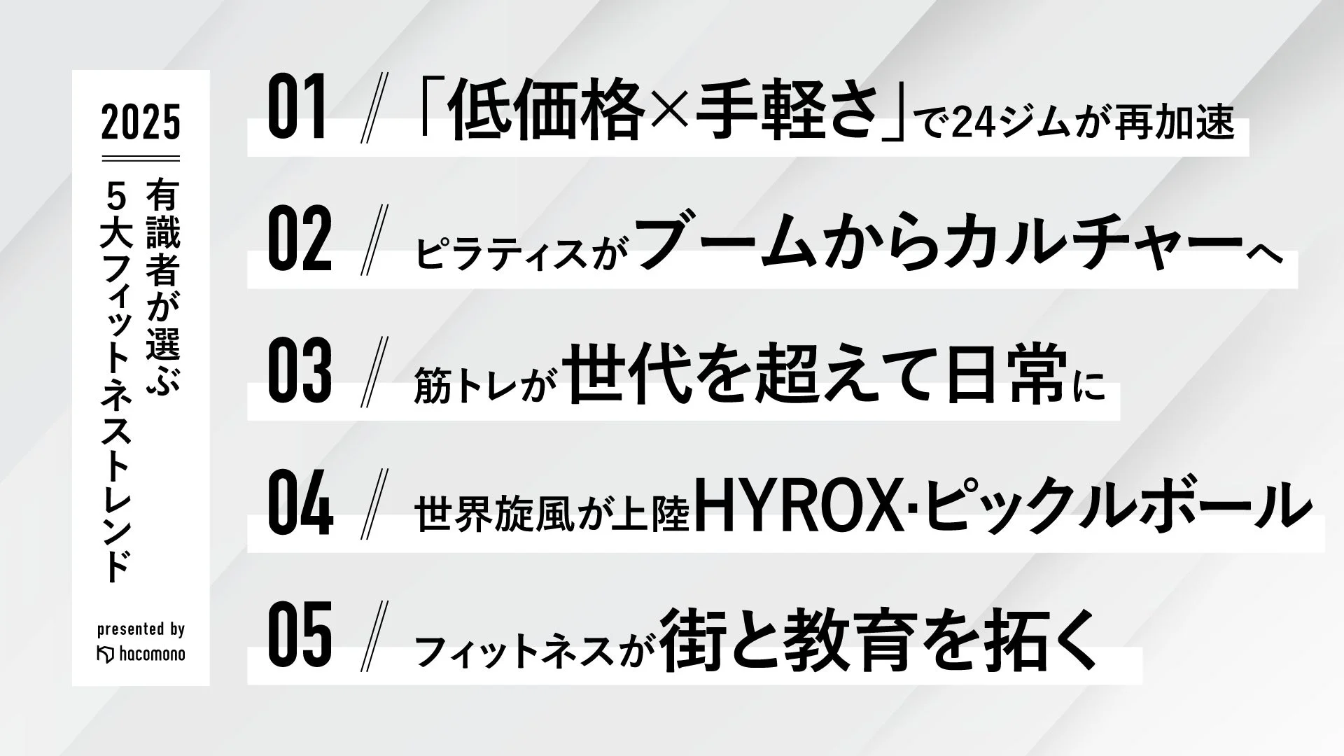 ウェルネス/運動施設向けオールインワン・マネジメントシステム「hacomono」を提供する株式会社hacomonoが、2025年12月9日に開催したトークセッション「hacomono Fitness Headlines 2025」で、フィットネス業界の有識者が選んだ「5大フィットネストレンド2025」を発表しました。RIZAPグループの鈴木氏や日本体育大学の岡田氏(バズーカ岡田氏)をはじめとする業界のプロフェッショナルたちが語る、最新トレンドを一緒に見ていきましょう!