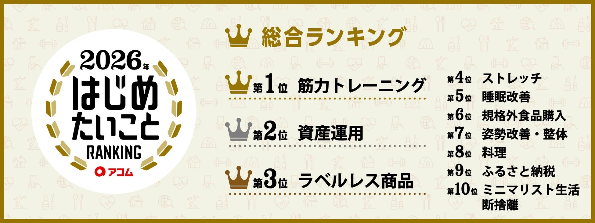 アコムが日本全国の10代から60代の2,000名を対象に行った「2026年 はじめたいことRANKING」では、日本中が2026年に“はじめたいこと”を大調査。今年で5回目を迎えるこの調査は、あなたが新しい「はじめたいこと」を見つけるヒントになるはずです。