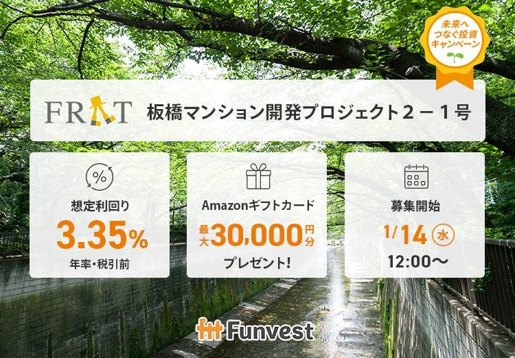 2026年1月14日より募集が始まるのは、「FRAT 板橋マンション開発プロジェクト2-1号」です。このファンドでは、出資額に応じて最大30,000円分のAmazonギフトカードがプレゼントされるキャンペーンも同時に実施されます。資産運用に興味がある方にとって、見逃せないチャンスかもしれません。